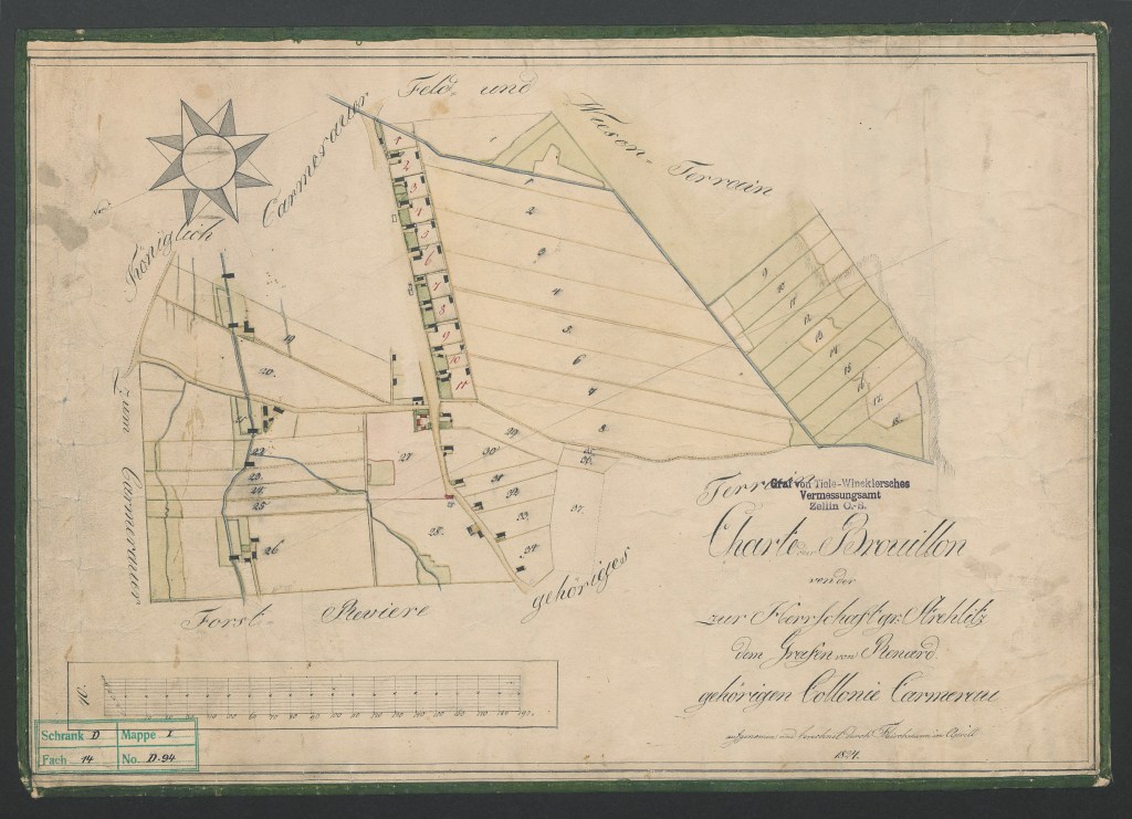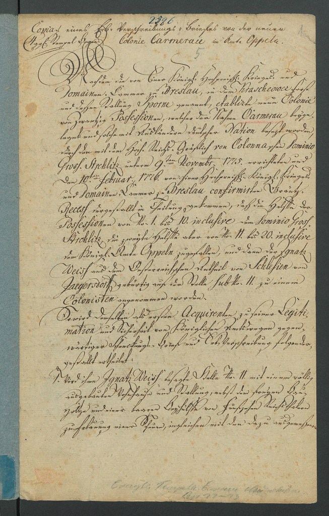 „Po tym, jak Królewska Izba Wojenna i Dominialna we Wrocławiu ustanowiła nową kolonię z 20toma posesjami w lesie krasiejowskim zwanym Sporne, której nadano nazwę Camerau, i obsadziła obcokrajowcami narodowości niemieckiej, podzielonej w wyniku recesu granicznego założonego przez hrabiego Colonnę w Strzelcach Opolskich dnia 9 listopada 1775 i potwierdzonego 10 lutego 1776 przez Królewską Izbę Wojenną i Dominialną, w ten sposób, że połowa posesji od numeru 1 do 10 przypadła dominium Strzelce Opolskie a druga połowa od numeru 11 do 20 Królewskiemu Urzędowi w Opolu, powołuje na kolonisty Ignatza Weissa z Karniowa z austriackiej części Śląska na posesję pod numerem 11”.
