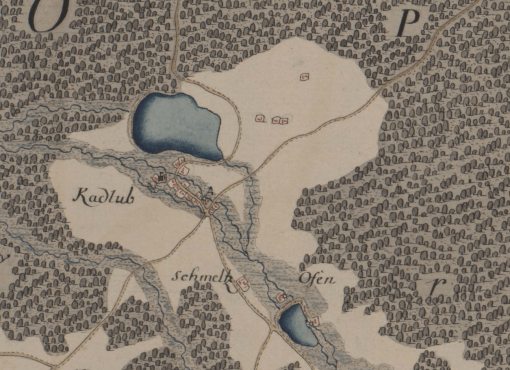 Kadłub na mapie w roku 1741. Wg legendy, w Kadłubie mieszka wtedy tylko 12 zagrodników i chałupników.