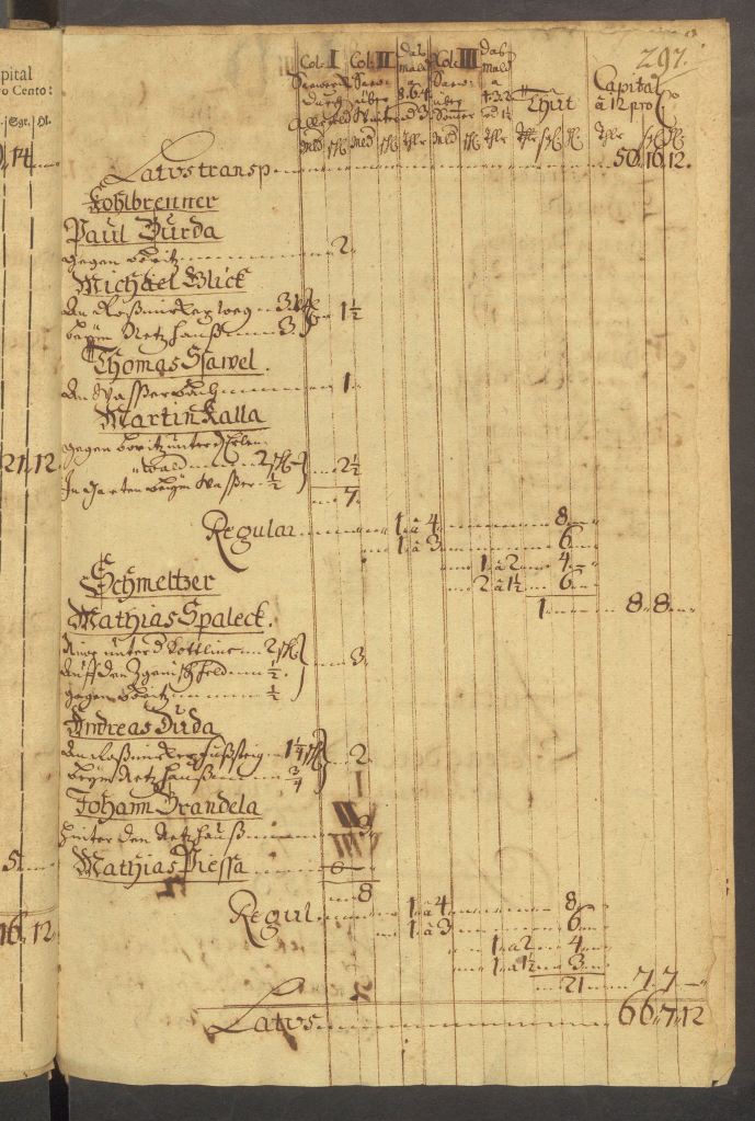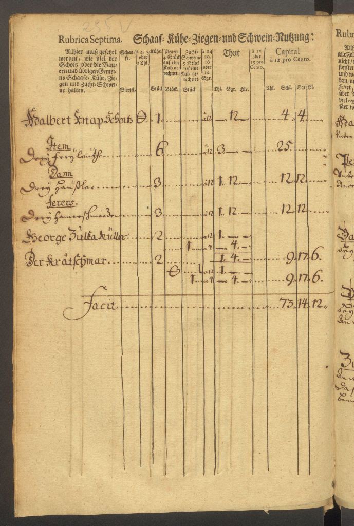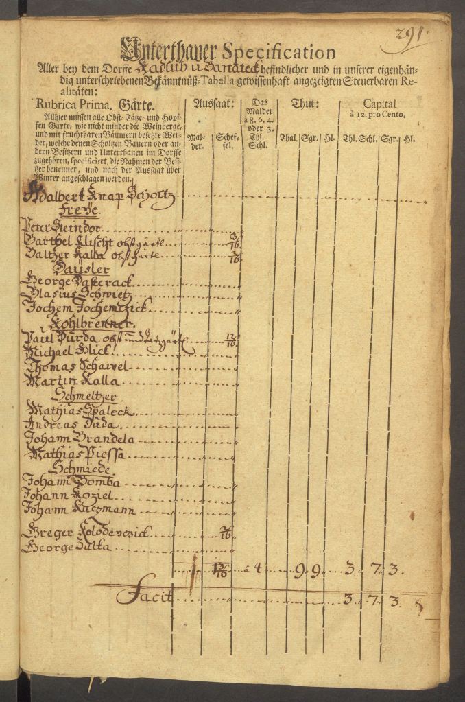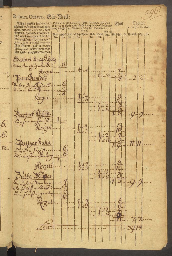 W kolejnych tabelach znajduje się wyliczenie objętości wysiewanego zboża i należnego od tego podatku, wraz z opisem, kto jakie pola posiada i gdzie się one znajdują. Na przykład sołtys Knapp posiada pole pod lasem dębowym, Barteck Klischt ma pole przy swoim domu, Baltzer Kalla przy drodze na Rosmierkę, Paul Kurda w stronę Boryczy, Josef Kutzman za karczmą i przy drodze na Grodzisko.