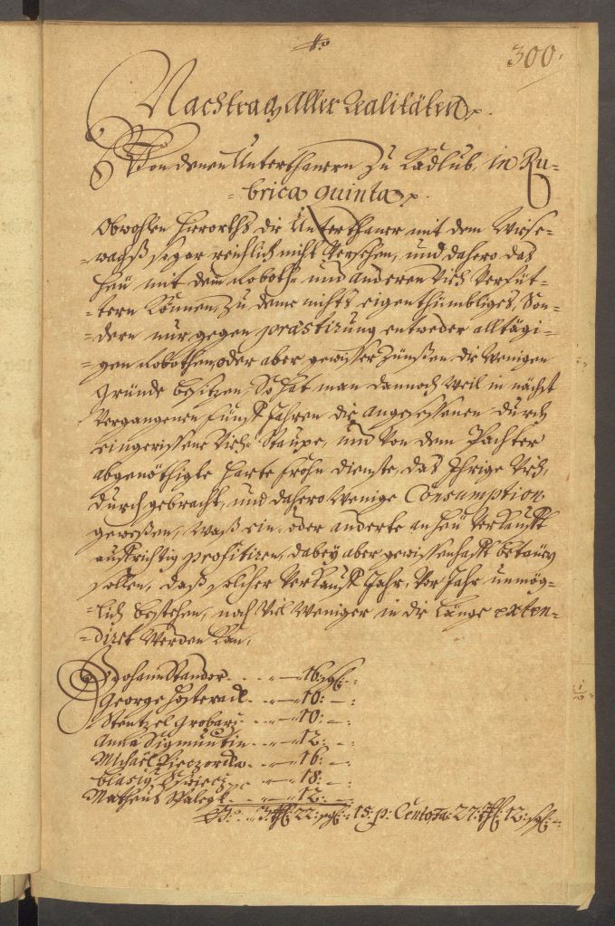„Mimo że poddani w tej miejscowości nie zbierają dużych ilości siana, którym można nakarmić bydło wykonujące pańszczyznę lub inne bydło, dodatkowo większość nie posiada ziemi, a jedynie wykonuje należne prace na rzecz majątku lub odprowadza czynsz, co więcej, w ostatnich pięciu latach panowała choroba bydła a i dzierżawca zmuszał do ciężkiej pracy pańszczyźnianej, z tego powodu konsumpcja była niewielka i co niektóry zarobił na sprzedaży siana, co też sumiennie zgłosił do opodatkowania, jednakże taka sprzedaż nie będzie możliwa co roku i brak możliwości jej przedłużenia.