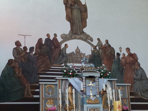 „Ołtarz był zwrócony na wschód, zgodnie ze zwyczajem. Nie było prawdziwego ołtarza, ale cała przednia ściana służyła jako ołtarz. Kazaliśmy tam namalować bardzo piękne malowidło ścienne: Chrystusa Króla i naszą parafię, poczynając ode mnie jako reprezentanta aż w dół do ministranta, jak wszyscy patrzymy na Niego w adoracji. Obraz był namalowany w formie fresku na ścianie. O ile dobrze pamiętam, malarz mieszkał z nami około trzech miesięcy i wybierał sobie modele spośród mieszkańców. Bardzo nam się to podobało. To było coś innego, coś, czego nie można było znaleźć nigdzie indziej w żadnym innym kościele.”