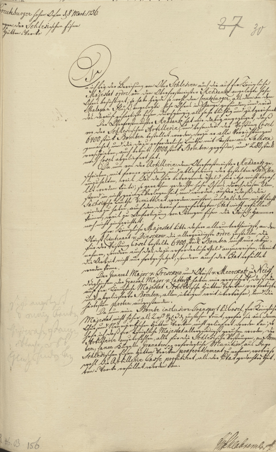 Da ich bey der Bereisung von Ober Schlesien auch die auf Eur. Königliche Majestat ordre von den Oberforstmeister Rehdantz angelegte hohe Ofens besichtiget; so habe beyde so wohl den Creutzburger, als den an dem Malapan Fluß, angelegte hohe Ofens in Gange gefunden, und wird das darauf gefertigte Eisen durchgängig als sehr tüchtig und gut gerühmet. Der Oberforstmeister Rehdantz hat mir dabey angezeiget, daß von der Schlesischen Artillerie, und besonder der Vestung Cosel6400 stück Bomben bestellet worden, wozu er alle Vorrichtungen gemachet, und die dazu erforderliche Leüthe mit Kosten aus Sachsen verschrieben, auch bereits 1000 stück Bomben gegoßen, und 280 stück nach Cosel abgeliefert hat. Da nun von der Artillerie dem Oberforstmeister Rehdantz geschrieben, mit ferner gießung und ablieferung der bestelten Bomben einzuhalten, weil das dafür betragende Geld für itzo nicht bezahhat werden könte; so gerathen gedachte hohe Ofens durch diesen Umstand in nicht geringe Verlegenheit, und würden, außer daß die