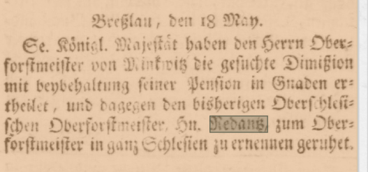 8 maja 1765 Schlabrendorf donosi królowi, że Rehdanz zmarł 7 maja z wycieczenia po walce z chorobą. I że na jego miejsce musi być wybrany człowiek, który zna się i na leśnictwie i na hutnictwie (zawoalowana krytyka?). Proponuje więc leśniczego z Scheidelwitz koło Brzegu, który ma otrzymać to samo wynagrodzenie, czyli 1000 talarów rocznie.
