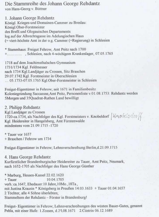 „Brak w dokumentach wskazówek odnośnie wykształcenia Hansa Georga Rehdantza. Wcześnie zaczyna pracę w służbie leśnej, awansuje na nadleśniczego w Krośnie (Crossen). Nakazem z dnia 29.07.1742 powołany zostaje na leśniczego na Górnym Śląsku a jego stanowisko dotychczasowe otrzymuje leśniczy Heese. W roku 1748 posiada mały wolny majątek w wiosce Fehrow w urzędzie Peitz. W maju 1753 zastępuje nadleśniczego von Minckwitza na stanowisku nadleśniczego dla Górnego Śląska.