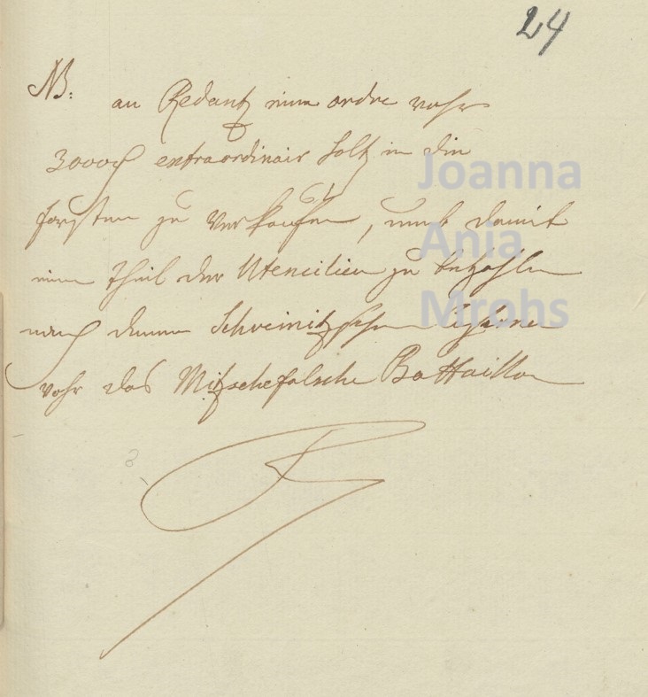 Osobiste rozkazy Fryderyka kierowane do Rehdantza, tu na sprzedaż dodatkowych pozabudżetowych ilości drewna i pokrycie z tego wyrobów dla koszarów Schrenitz.