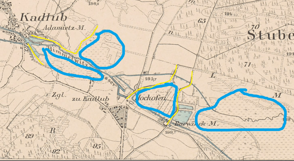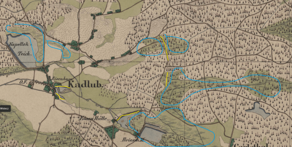 Na mapie widać staw przed hutą w Osieku, potem dwa stawy przed młynem Barwinek, jeden przed hutą na Piecu, i olbrzymi staw w okolicach dzisiejszej drogi do Krasiejowa.