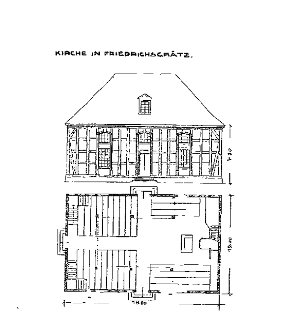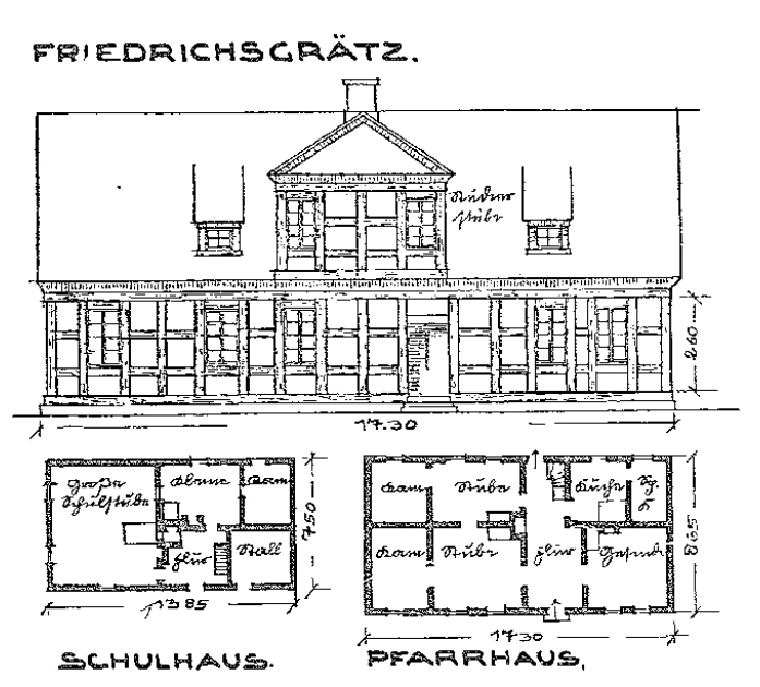 Jeszcze paskudniejszym rozdziałem w historii rozwoju Friedrichsgrätz była budowa plebanii, na którą przeznaczono budżet 163 talarów. Umowa na budowę została zawarta w 1754 roku z mistrzem murarskim Petersem w Opolu. Stan surowy został wkrótce ukończony, ale na tym etapie stał nadal, gdy 13 lat później rozpoczynano budowę kościoła, z powodu błędu formalnego w umowie o budowę. Wykonanie konstrukcji szachulcowej było zarówno ujęte w planie mistrza murarskiego, jak i powierzone kolonistom do jego realizacji. Każdy zrzucał pracę na drugiego. Izba była bezsilna ze względu na niejednoznaczność umowy. Ostatecznie koloniści chcieli kleić, a nie wyposażać. Wtedy zamierzano dokończyć plebanię wraz z budową kościoła. Ale do ukończenia budowy minęły jeszcze lata. W 1767 r. wybudowano także szkołę, na którą przeznaczono 235 talarów. Plan przedstawia większą salę lekcyjną na lato i znacznie mniejszą na zimę, kiedy do szkoły przychodzi niewiele dzieci. Inspektor budowlany Pohlmann był szczególnie dumny z tego wynalazku.