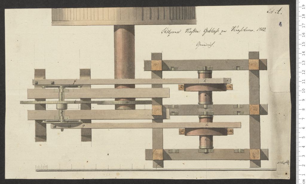 Malapane 18te Octbr 1814. 4 Beilen den 10. 8t 15 K VI. 16. Kasten Gebleese Holzernes So wie aus beiliegenden Aufsätzen zu Krascheow. von 10ten October und 10te December 1810. zu ersehen ist, solte das Krascheower Welein Cylinder Geblüse von 4 Stück 40 Zölligen einfachen aber gepannten Blase Cylinder mit horisontaten Lenkerstangen erhalten, welches so wie das Jedlitzer Gebläse mitten in die Arche eingebaut werden solte; und zwar solte das BlaseHaus den möglichst kleinsten Raum in der Arche einnehmen und parallel mit