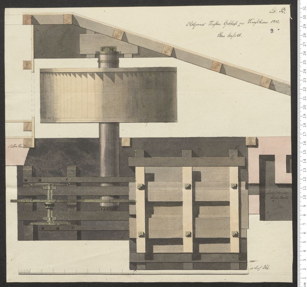 May, mithin in der festgesetzten Zeit den Rohrhammer Nro 8 an zu arbeiten. die übrigen Werke und das neue Kasten Gebläse würden wenige Tage nachherauch in Gang gekommen sein, allein der westliche Horizont trübte sich sehr, die Arbeiten entfernten sich, und den 2ten Jun. da die Herren Karsten und Wedding erschienen, müste ich von einer möglichen baldigen Wieder Vernichtung dieses nach meiner und vieler anderer Meinung riesenhaften Umbaues hören. Während den 14 Tagen dieses Umbau es. war mir es nicht möglich das in 1810 projectirte Cylinder Gebläse einzubauen hauptsächlich, weil zu diesem nichts als die Zylieder selbst vorräthig wären, und wegen der so strengen Befehle, den Munitions Guß in Malapane auf das lebhafteste zu betreiben, nicht auf einen zentner Gußwaar zu rechnen warIch entwarf daher den Plan zu den