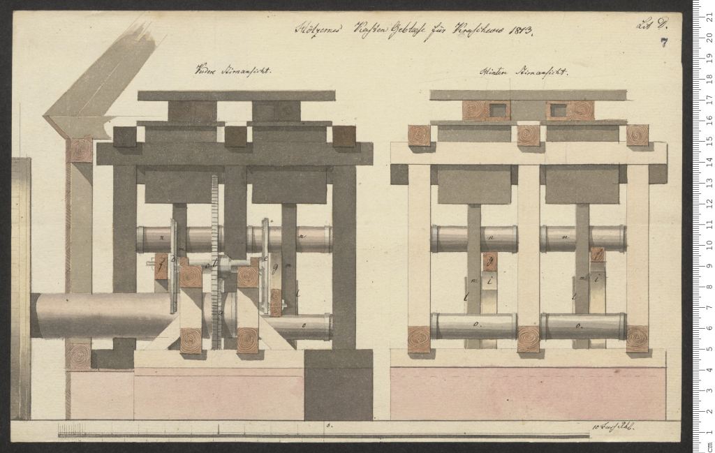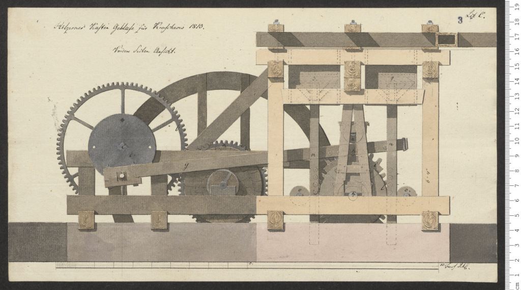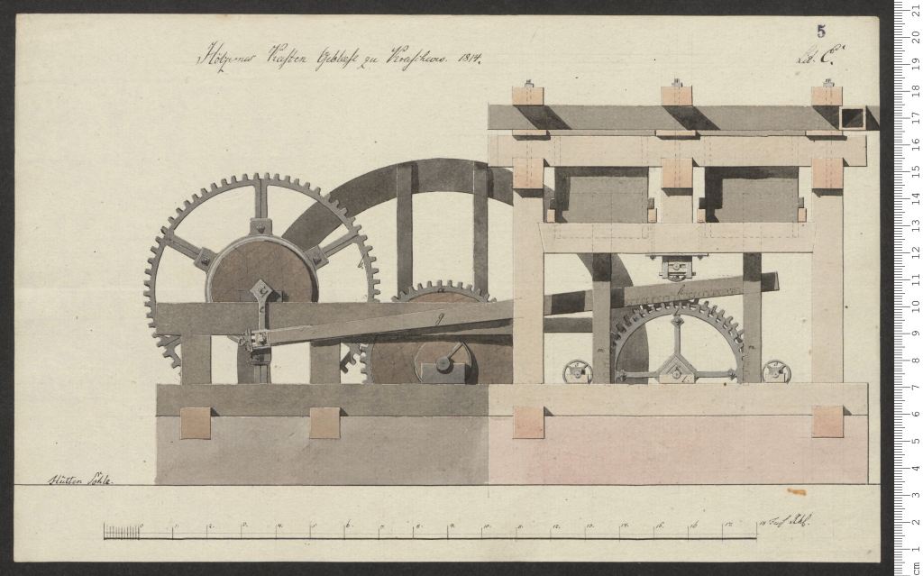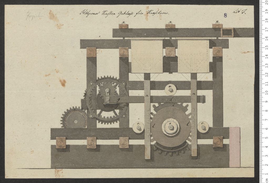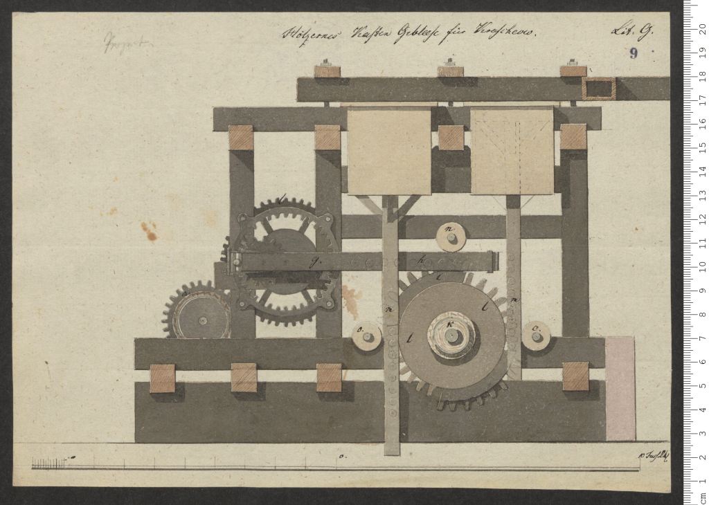 gegenwärtigen Kasten Gebläse für sämtliche Kreschiower Feuer, und ließ alles was nur möglich war von Holz anfertigen, benutzte von vorräthigen Gußwaren was ich konnte, und so habe ich denn ein einziges Getriebe in Gleiwitz gießen lassen, und indem ich dachte, es sei nichts zu schlecht, als daß es nicht auch zu etwas gut sei, wolte ich ein ganz hölzernes Geblöse darstellen, welches auch nachgenhmt zu werden verdiente. der