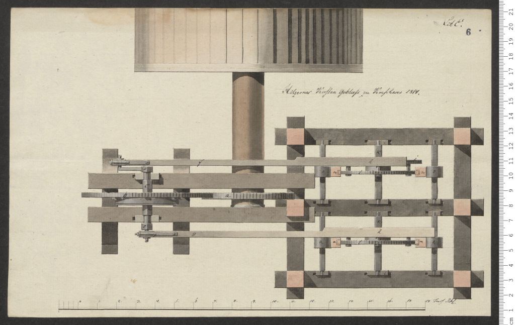 Der Platz wurde dem Gebläß Wasserrade durch den Grundbau den alten Arche nach Verlegung des Plettienenhammer Wasserrades gegeben, und diesem mußte ich mein Gebläse anschmiegen. Es ist über ein Jahr ganz hötzern gewesen wie die Zeichnungen A. B. C. D. es derstellen, und erst in diesem Jahre, da mehrere Zähne an den Zugrädern brachen, habe ich Zuräder Jahnstangen Zugwellen und Friction Wellen mit gußeisernen ausgewechselt. wie die Zeichnung C darstellt. das Gebläse ist außerdem, daß es ein Vorgelege erhalten müste ganz nach jenem Plane de 1810 eingerichtet und hat nachstehende Construction. Das Getriebe a auf den Wasserrads Welle bewegt des Getriebe b. dieses ist auf eine Triebwelle c befestigt, die um so viel höher liegt als die Wasserads Welle, daß die hintere Lenkerstange von der Wasserrads Welle nicht erreicht wird. Die Triebwelle c. hat zu jeder Seite eine Kurbel (Krummzapte) D. E. an welchen sich die horisontalen Lenkerstangen f. g. bewegen, das von den Krummzupten Bolzen entfrente Ende k der Lenkerstange ist auf der Unterfläche gezahnt, und grrift in ein gezähntes Zugrad i, welches es bei dem rotiren der Triebwelle vor und zurück-schiebt. Das Zugrad i ist auf die Zugwelle k befestigt, die sich in Lagern l. l. bewegt und neben dem ersten Zugrade i ist auf jeder Zugwelle ein zweites Zugrad 1 befestigt, dieses gerift zu jeder Seite in eine gegen das Zugrad gezähnte Kolbenstange m, und zieht die Kolbenstange auf und abwärts, wenn die Triebwelle c sich um ihre Axe dreht. Damit die Lenker stangen, und Kolbenstangen jedoch nicht aus den Zugrädern ausweichen können, ist über die Lenkerstange des Frictions Rad n, und hinter den Kolbenstangen die Frictions Scheiben o, o, angebracht. Jede Kolbenstange hat einen Kolben der in einem 30 Zolle weitem Blasekasten auf- und abwärts gehet, und jedwede paar Kolben sind dergestalt miteinanden gepaart, daß ihr Gewicht sie untereinander ausgleicht. Jeder Blasekasten giebt bei einer Evolution 15 Cubicfuss, mithin alle 4 bei einem Umgänge der Triebwelle c – 60 Cubicfuss, und bei 8 Umgangen pro Minute 480 Cubicfuss Wind, womit gegenwärtig 6 Schmiedefeuer als einPlettieren Feuer 4 Rohschmiedefeuer, und ein Bohrschmiede Feuer beblasen werden, und das entfernteste Feuer ist von den Windladen in den Windröhrengemessen über 120 Fuß entfernt. Die Windleitungsröhren sind von Holz und nur die im Freien über die Arche zur zweiten Hütte gestreckten sind von Gußeisen, weil während dem Baue des Gebläses nur grade eben so viel eiserne Röhren vorhanden waren. Jedes Feuer hat auch einen hölzernen Windsperrungskasten mit Ausblase Oefnung, die der Weite der Düßen Oefnung gleich ist, und das Gebläse ist die ganze Woche in fortwährendem Gange. Die Eile mit der dieses Gebläse gebaut worden ist, und der Umstand, daß keine Gußwaaren zu haben waren haben. Misverhältnisse herbeigebracht, die ich nicht passender machen konnte. Noch lege ich vorliegendem zwei Blatt Zeichnungen I und G bei, die dasselbe Gebläse in veränderten Manier darstellen, wie es aber aus oben angeführten Gründen nicht hat ausgeführt werden können. die Lankerstangen solten sich nach dieser Idee stets ganz horisontal bewegen, anstatt daß sie gegenwärtig mit den Krummzäpfen steigen und fallen, und die Frictions Scheiben n nicht jederzeit an die Lenkerstangen ganz anschließen. Es ist die Anwendung des Krumzapfens mit gezähntem Rade im nach einwärts gezähnten Kreise, die jedoch des Gebläse 12 nur complicirter gemacht haben würde. und nur in dem Falle angewendet werden dürfte, wo die Lenkerstangen nur ganz kurz sein können.