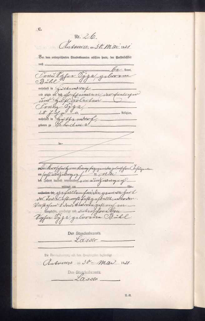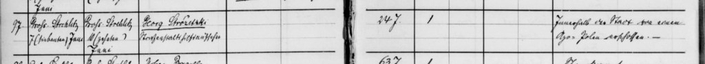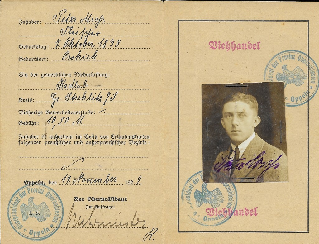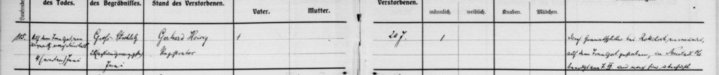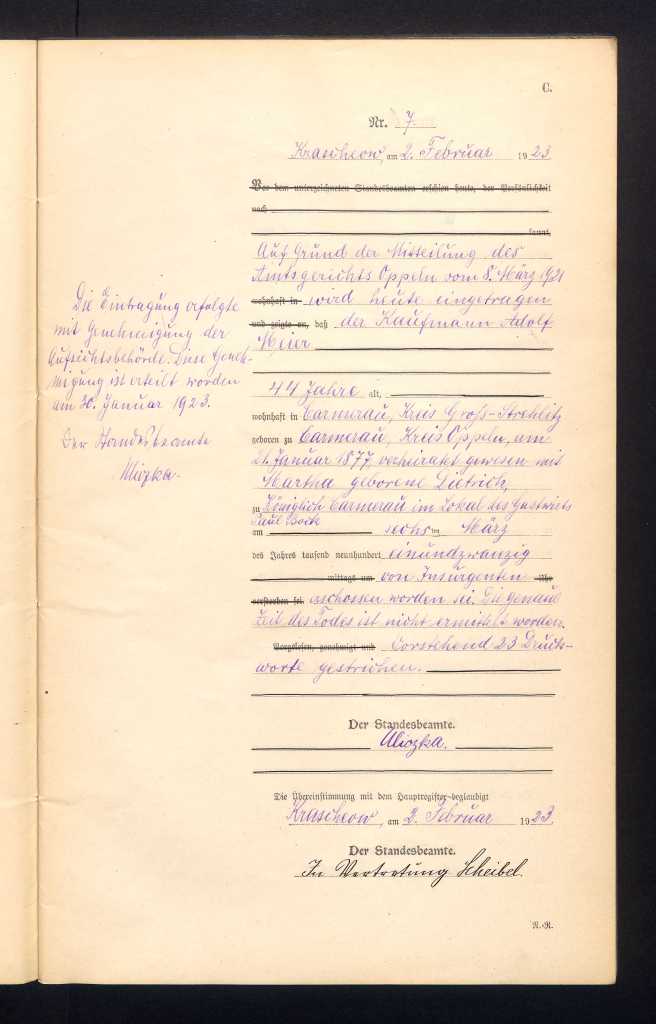 Auf Grund der Mitteilung des Amtsgericht Oppeln vom 8. März 1921 wird heute eingetragen, daß der Kaufmann Adolf Meier, 44 Jahre alt, wohnhaft in Carmerau, Kreis Groß-Strehlitz, geboren in Carmerau, Kreis Oppeln, am 21. Januar 1877, verheiratet gewesen mit Martha geborene Dietrich, zu Königlich Carmerau im Lokal des Gastwirts Paul Bock am sechsten März des Jahres tausend neunhundert einundzwanzig von Insurgenten erschossen worden sei. Die genaue Zeit des Todes ist nicht ermittelt worden. Vorstehende 23 Druckworte gestrichen.