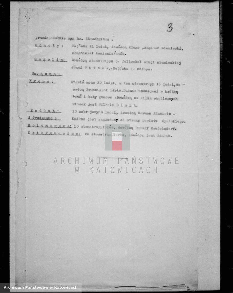 Organizacje bojowe: Istnieje w powiecie organizacja, do której należą ludzie V.H.O.S (Wierni Heimatowi Górnoślązacy) i leśniczy. Uzbrojenie powiatu dobre. Siła zorganizowana na powiat liczy około 900 ludzi. Powiatowym jest nauczyciel Langer lub hrabia Strachwitz.
