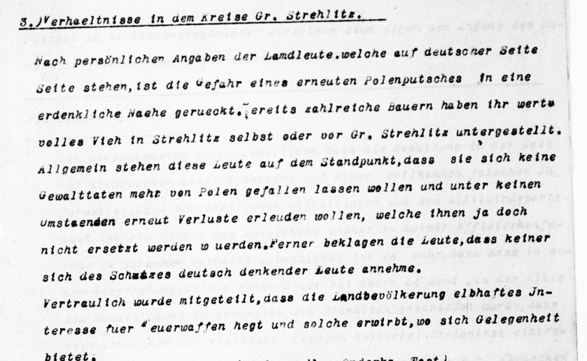 Niemiecki wywiad (Bundesarchiv) także był dobrze poinformowany. Szpiedzy z terenu powiatu strzeleckiego donosili, że Polacy rozpoczną walki w kwietniu, jak pogoda pozwoli. Rolnicy ewakuowali wartościowe bydło do Strzelec albo w okolice miasta. Ludność kupuje masowo broń.