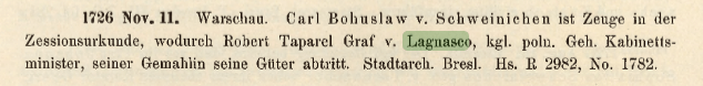 Kolejnym właścicielem jest hrabia Robert Taparel Lagnasco. W roku 1726 odstępuje swoje majątki żonie hrabinie von Waldstein.