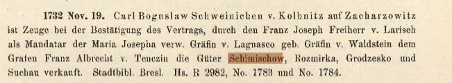 Hrabina von Waldstein w roku 1730 dokupuje Szymiszów od Anny Julianny Skal z domu Praschma, a w roku 1731 Suchą od Anny Rogoyski z domu Zmeskal, aby w roku 1732 wszystko (Szymiszów, wraz z Rozmierzą, Suchą i Grodziskiem i Kadłubem) sprzedać Franzowi Albertowi von Tenczin, radcy cesarskiemu, najwyższemu sędzi i staroście księstwa opolsko-raciborskiego, synowi kanclerza Alberta Leopolda Grafa von Tenczin.