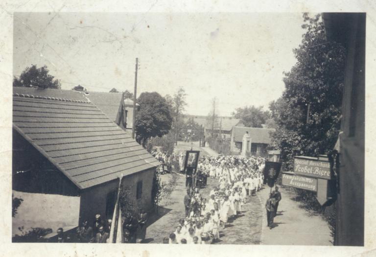 3 maja 1920, pochód przez Osiek, zorganizowany przez Alojzego Szulca (niesie sztandar). Zdjęcie pochodzi z książki: Ryszard Kaczmarek „Powstania Śląskie – Nieznana wojna polsko-niemiecka”