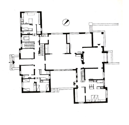 Projekt rzut domu został dokonany po szczegółowych konsultacjach z inwestorem. Skrzydło gospodarcze i skrzydło gościnne znajdują się po lewej i prawej stronie głównego wejścia; środek domu zajmują pomieszczenia mieszkalne i towarzyskie, a następnie sypialnie dla właścicieli, połączone małymi schodami z pokojami dzieci, które znajdują się na zaadaptowanym poddaszu. Uwzględnienie kierunków świata i istniejącego drzewostanu dało obecne rozwiązanie planu.