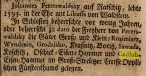 Kronika szlachty śląskiej wspomina, że w roku 1728 Kadłub wraz z pracującą tam fabryką żelaza dalej należy do Johannesa von Peterswaldskyego.