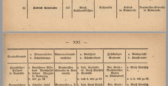 Poniższy wycinek z Landbote z roku 1916 pokazuje sytuację administracyjną Kadłuba. Sołtysem był Thomas Mross właściciel karczmy, Kadłub miał 837 mieszkańców, placówka pocztowa znajdowała się w Fosowskim, sąd rejonowy w Rozmierce, zarządcą okręgu administracyjnego był Gomolla z Rozmierki, urzędnikiem USC nauczyciel Piekarek z Grodziska, poborcą podatkowym karczmarz Nikolaus Wieschollek z Grodziska, sędzią sądu polubownego nauczyciel Wenzler z Rozmierzy, parafia katolica to Grodzisko, ewangelicka Strzelce Opolskie, żandarmem był wachmistrz Better w Izbicku.